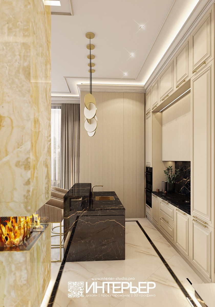 - Остров в зоне кухни — добавили камень по бокам вместо фасадов, а также завернули столешницу за рокавину, чтобы защитить от брызг.