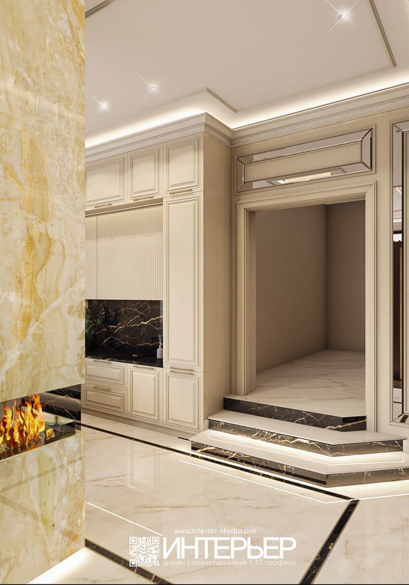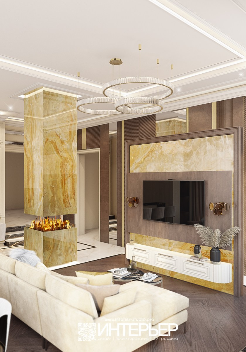 - Изменили тв-зону, как вы просили посмотреть, как будет смотреться тв зона с 1 варианта, также изменили высоту не до потолка и добавили бра из той же коллекции, что и люстры над столом в поддержку.