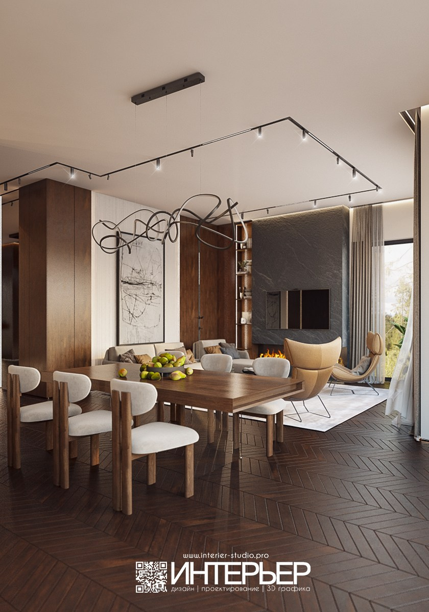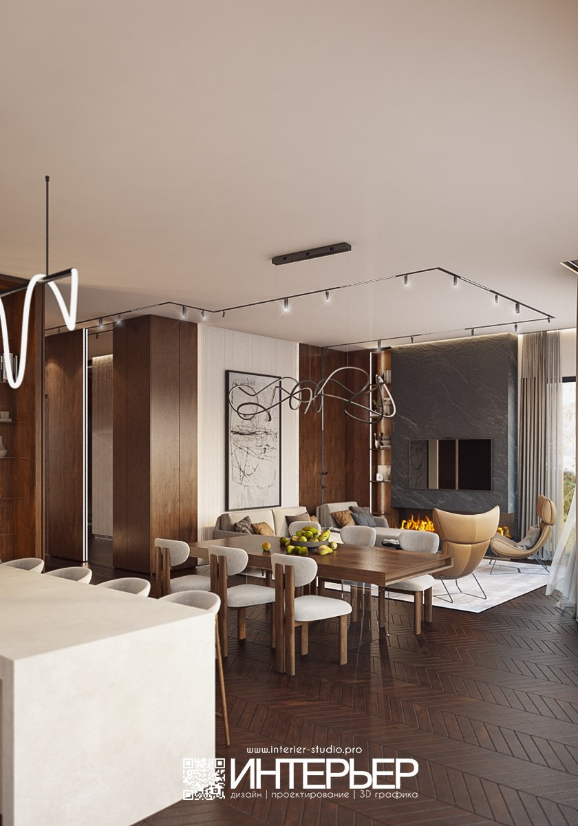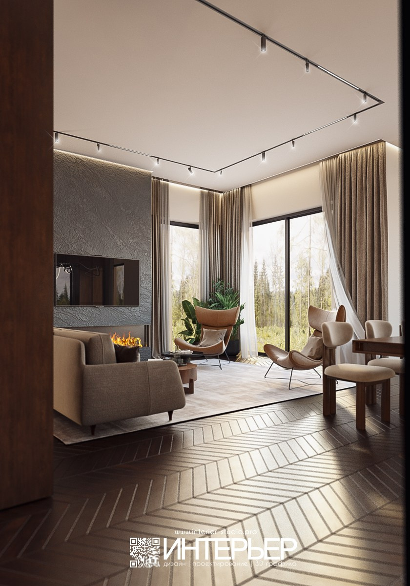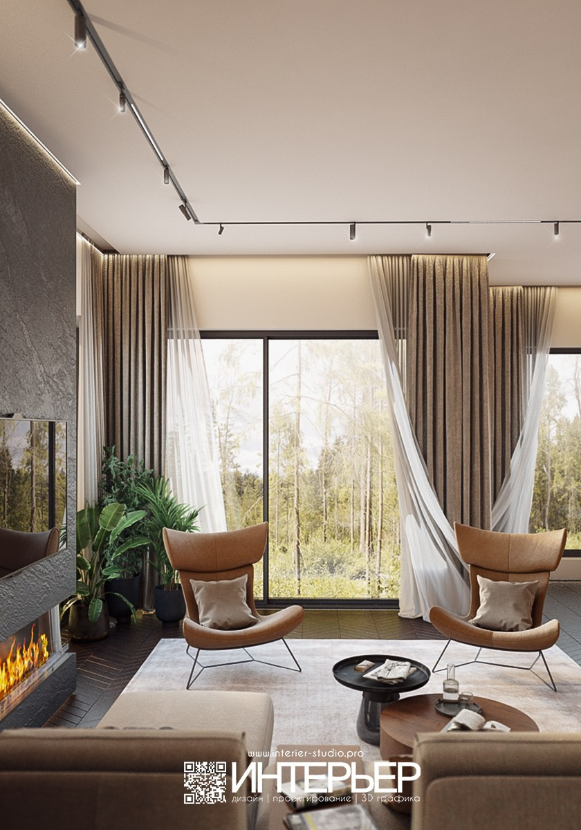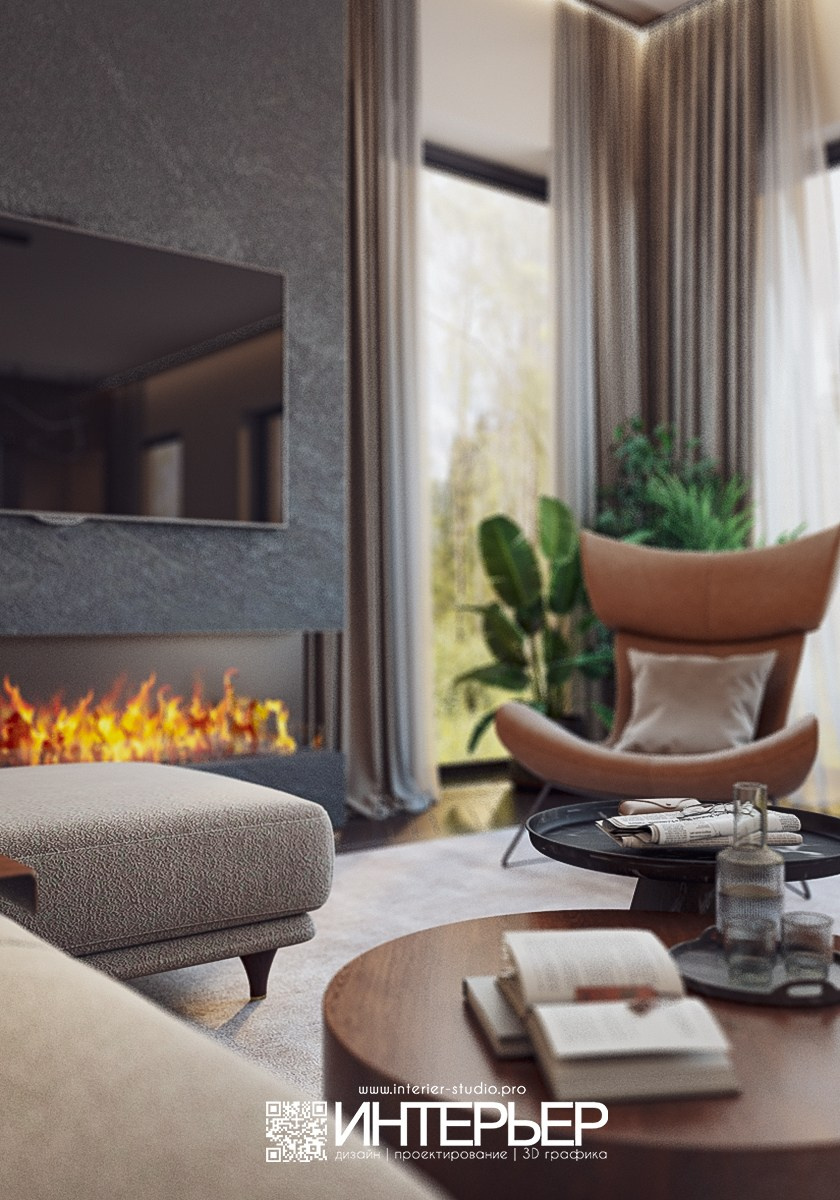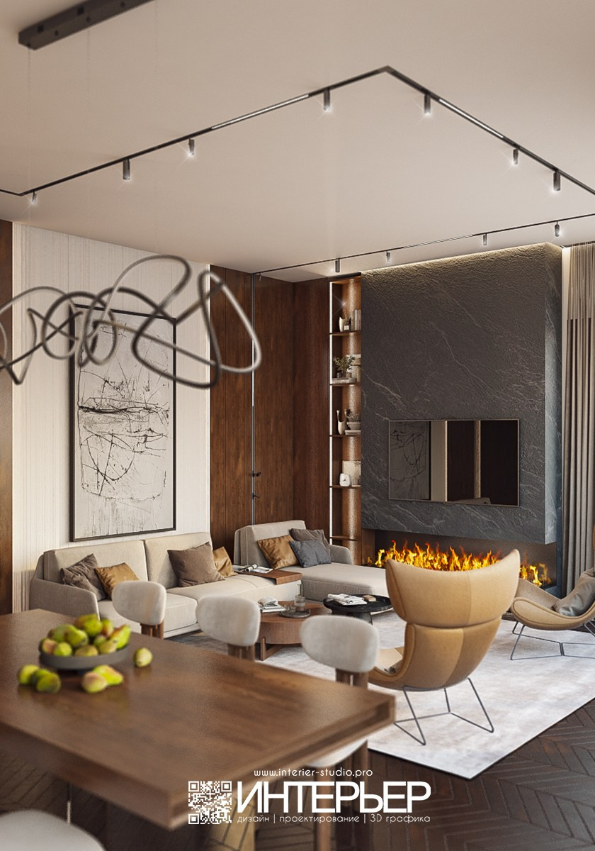 — убрали черные элементы, оставили только в зоне камина каменный шпон или керамогранит, но с другой текстурой, ближе к графиту, а не насыщенному черному