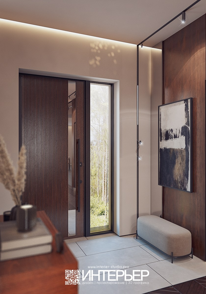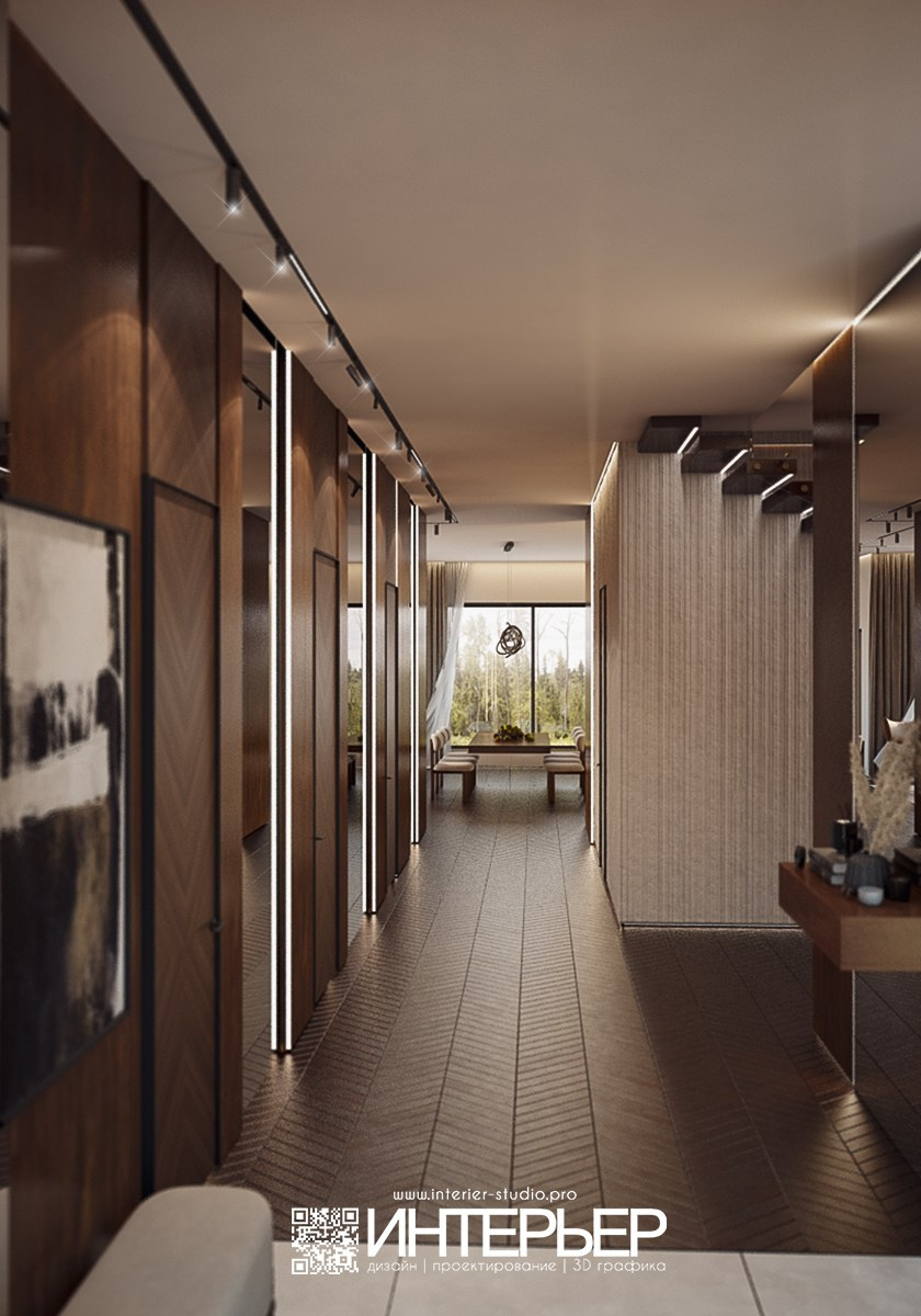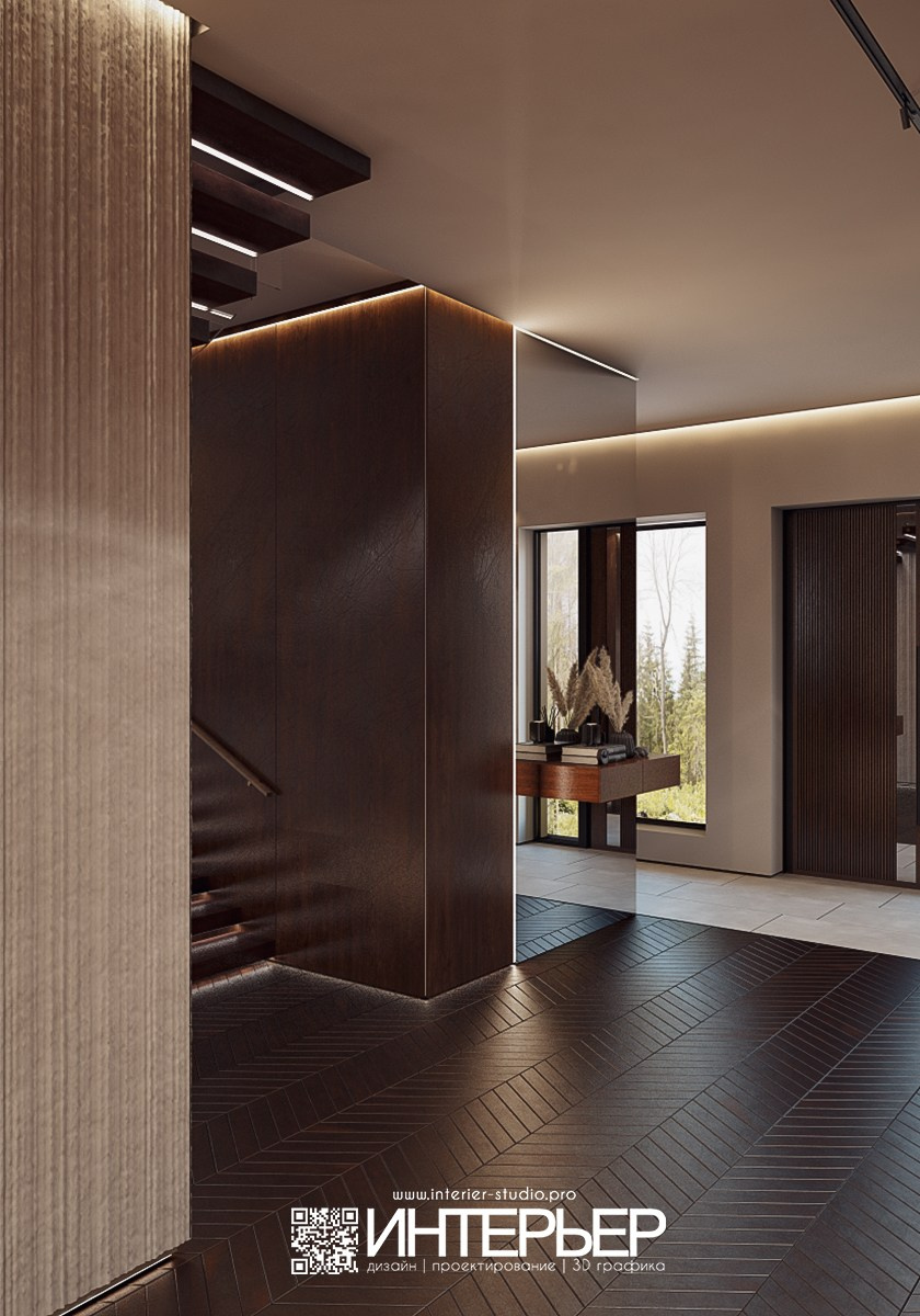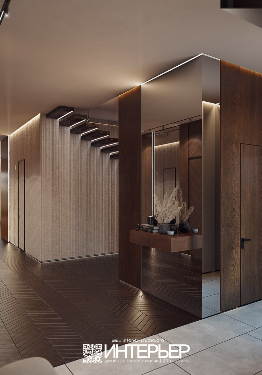 — справа в зоне лестницы также немного изменили покрытие стены и встраиваемая дверь там идет в таком же материале, как и стены, чтобы визуально было красивее