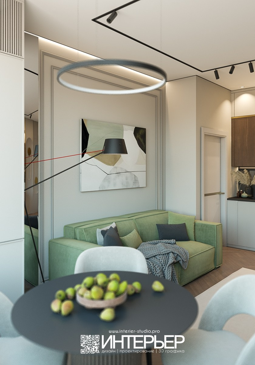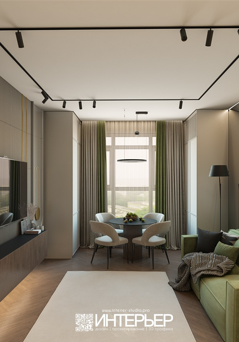Столовая группа расположена ближе к окну — это круглый стол с матовой поверхностью и мягкие оливковые стулья, перекликающиеся с диваном по тону. Большие окна наполняют эту часть помещения естественным светом, создавая атмосферу комфорта и гармонии.