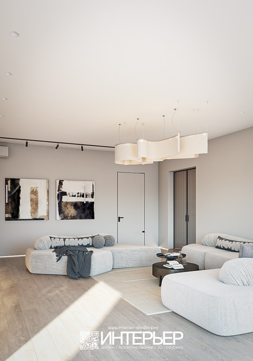 Цветовая палитра построена на светлых натуральных оттенках — молочном, бежевом и тёплом древесном. Мягкие диваны округлой формы формируют уютную зону отдыха, а натуральные текстуры — дерево, камень и фактурная ткань — добавляют глубину и тепло.