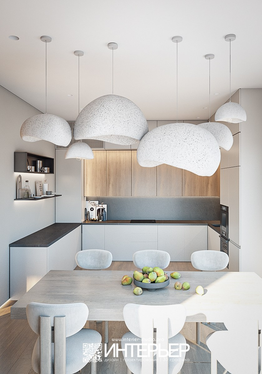 Отдельное внимание привлекают подвесные светильники органичной формы — они напоминают природные объекты и смягчают строгую геометрию кухни. Обеденная зона продолжает общую концепцию: светлый стол с естественной текстурой и мягкие стулья округлой формы создают ощущение комфорта.
