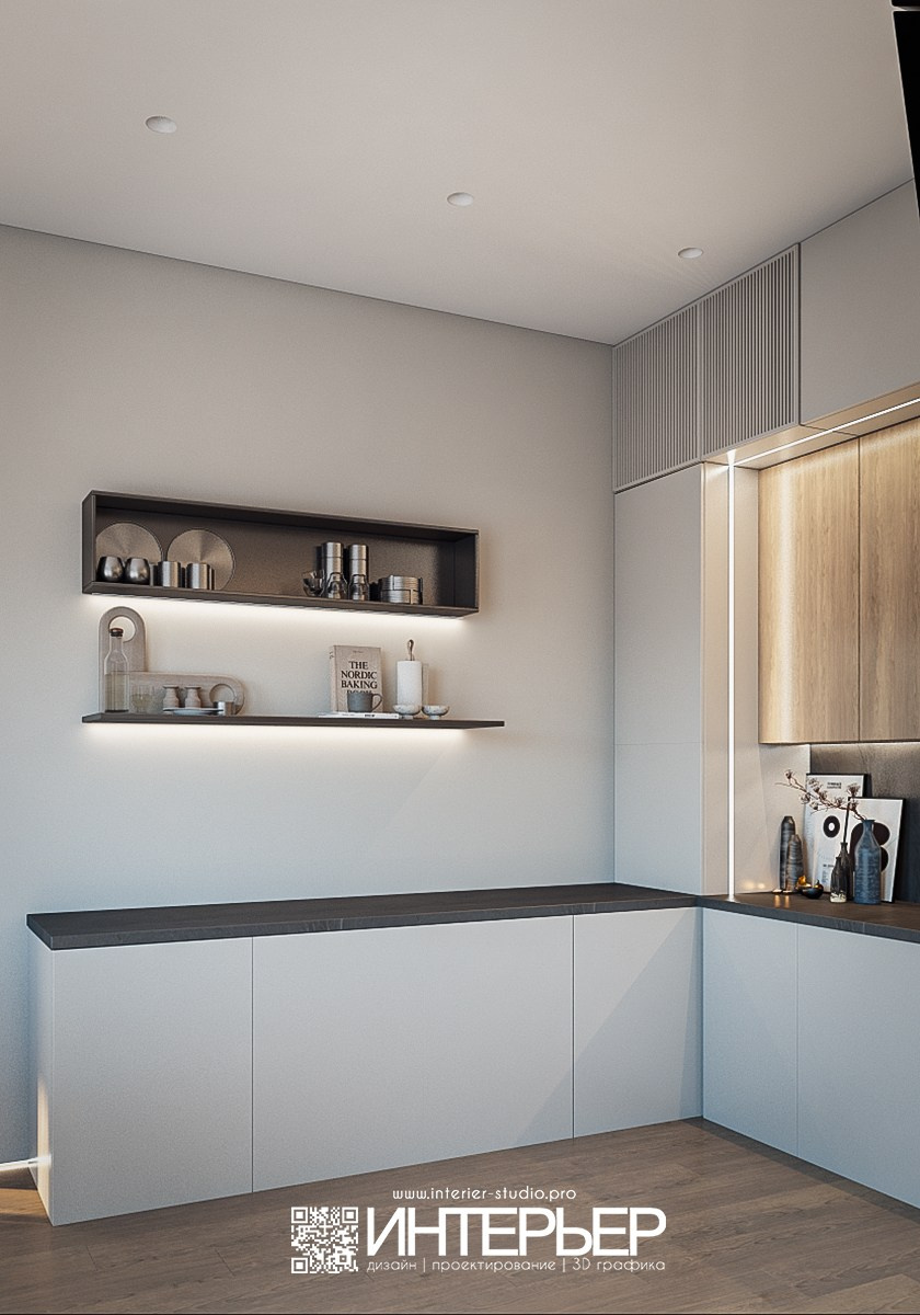 Гарнитур решён в сочетании матовых светлых фасадов и натурального дерева верхних шкафов. Тёплая текстура древесины добавляет уюта и баланса холодной светлой базе. Рабочая зона оформлена минималистично: ровные фасады без лишнего декора, встроенная техника, аккуратная подсветка фартука.