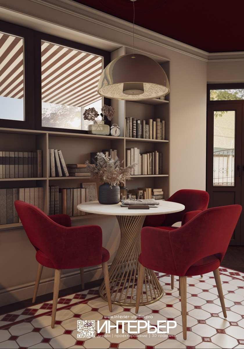Пол — классическая плитка с геометрическим рисунком в бело-бордовой гамме связывает все элементы воедино, создавая ритм и визуальную гармонию. Такое сочетание цветов формирует богатую, но не перегруженную атмосферу, где царит ощущение вкуса, тепла и интеллигентной утончённости.