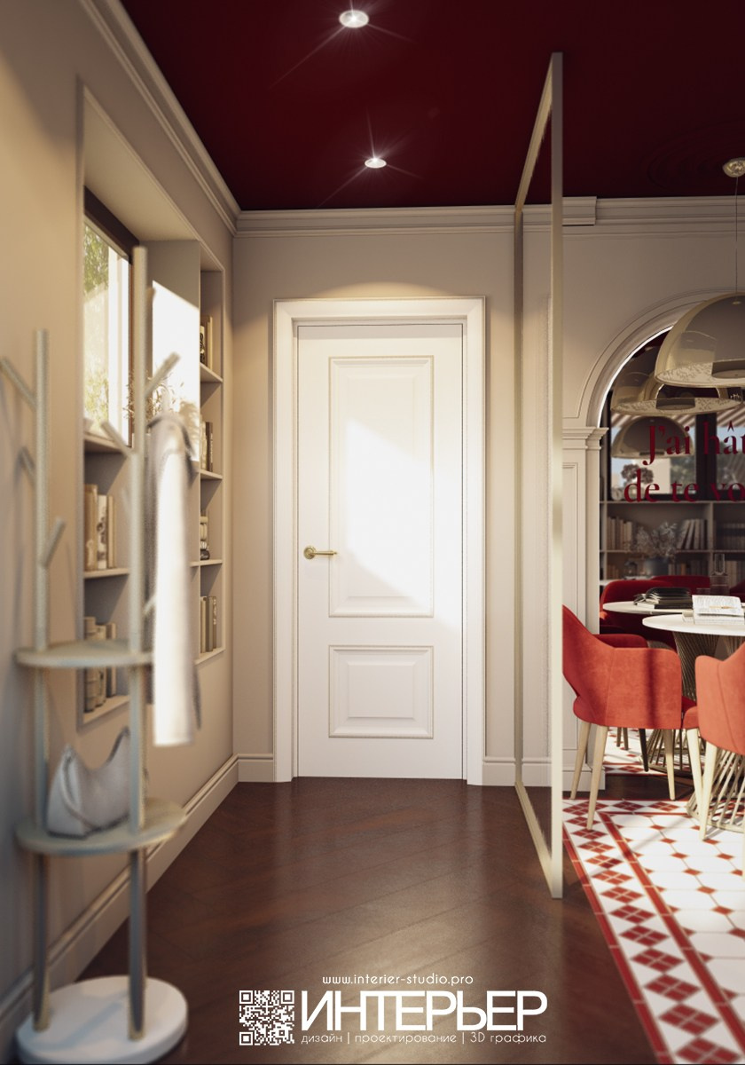 Потолок — глубокий, насыщенный бордовый, создаёт ощущение уюта и камерности, словно «укутывает» посетителей, наполняя зал теплом.