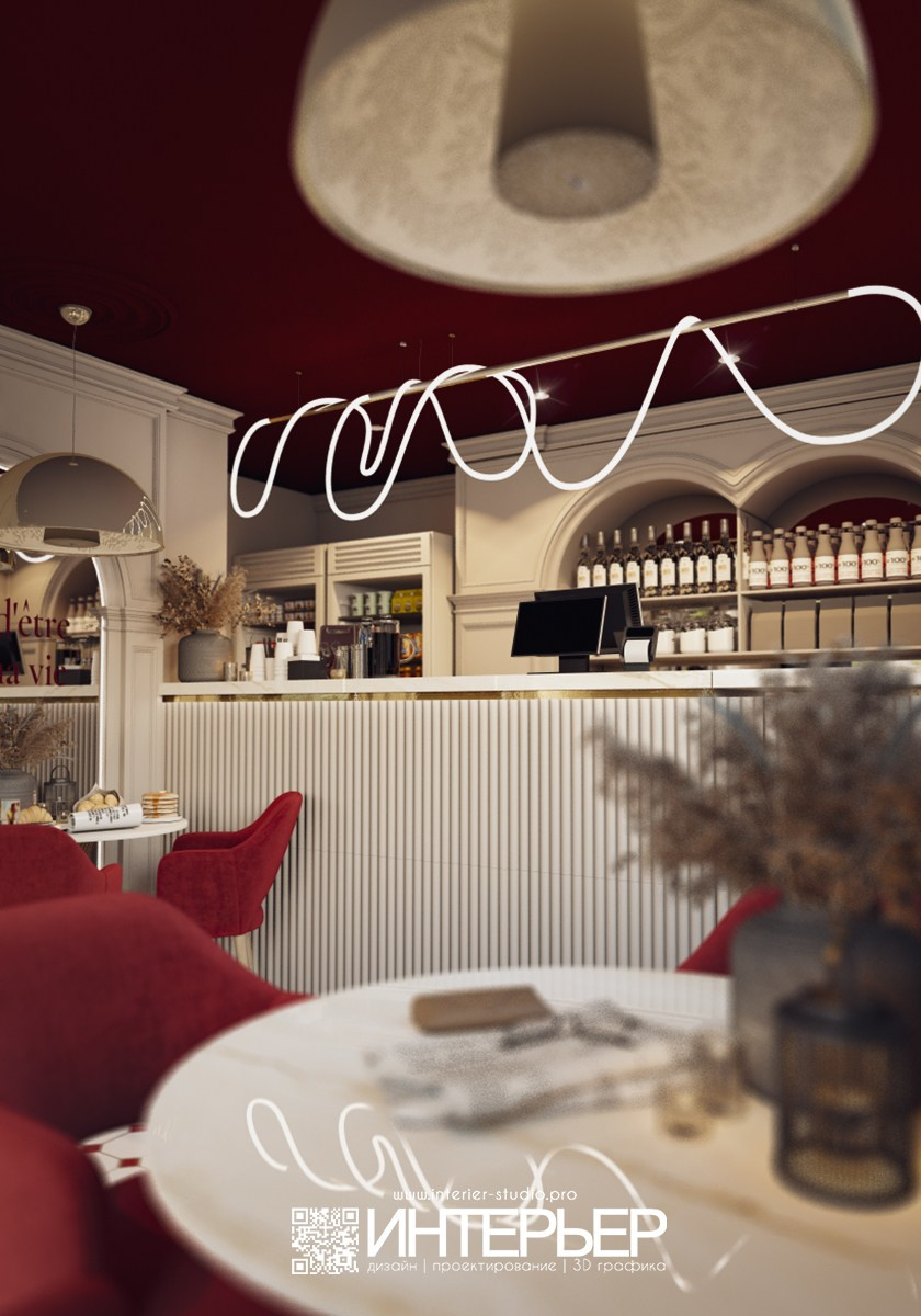 Интерьер кафе погружает посетителей в атмосферу утончённого покоя. Здесь классика не выглядит архаично, а звучит современно — через игру света, зеркала и насыщенные акценты. Бордовые тона добавляют чувственности и тепла, а золотые детали и мягкое освещение создают ощущение праздничности и комфорта.