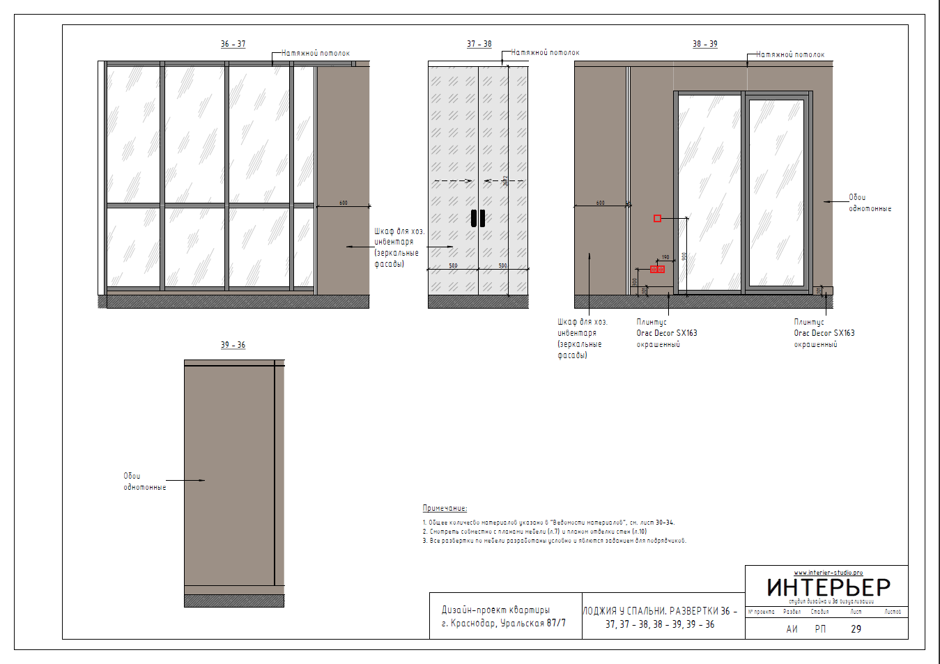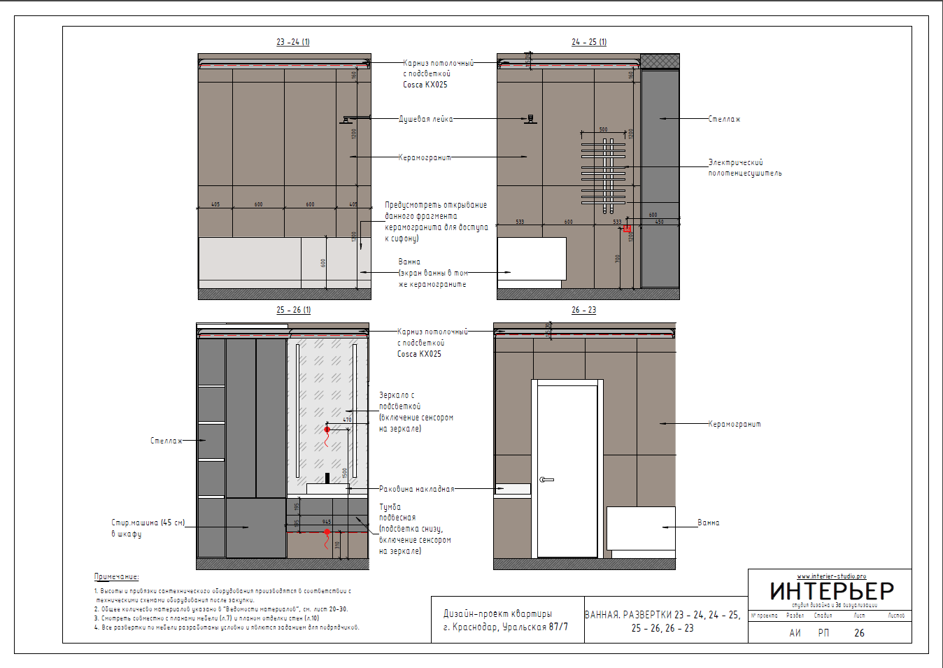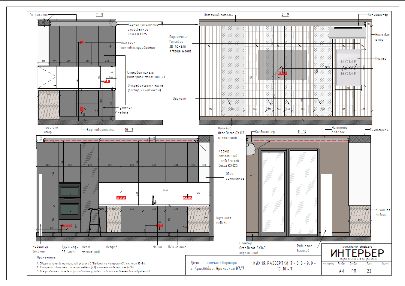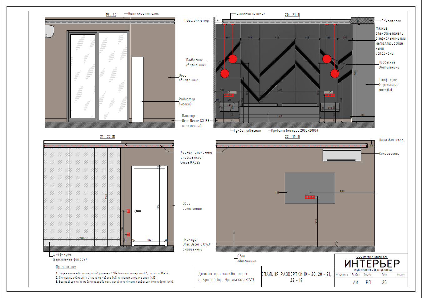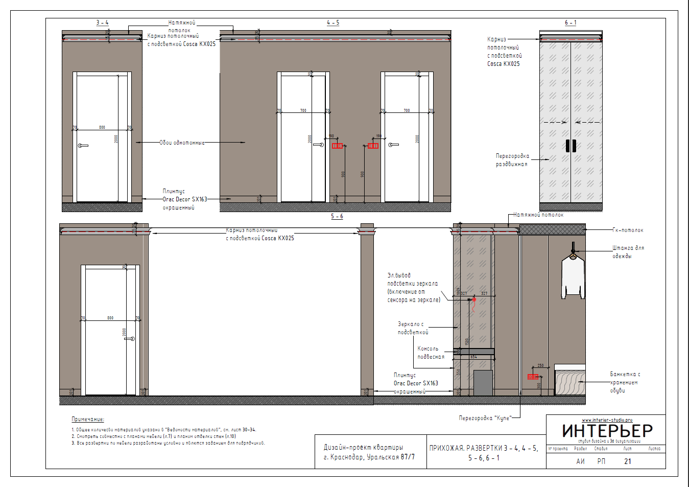 Развёртки стен показывают детальное расположение всех стен помещения в масштабе, включая двери, окна и встроенные элементы. В нём указываются отделочные материалы, декоративные детали, розетки и выключатели. Этот чертёж помогает точно выполнить отделку и корректно разместить интерьерные элементы.