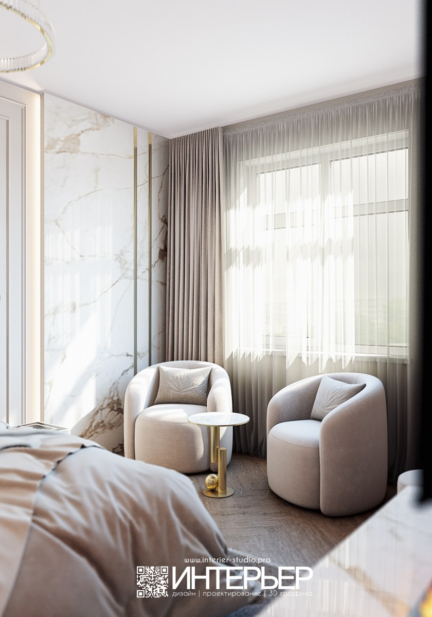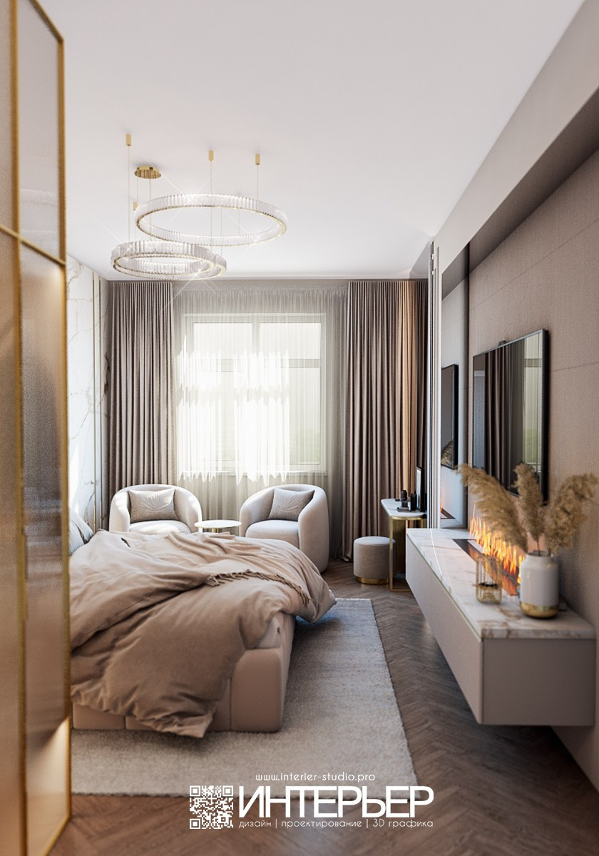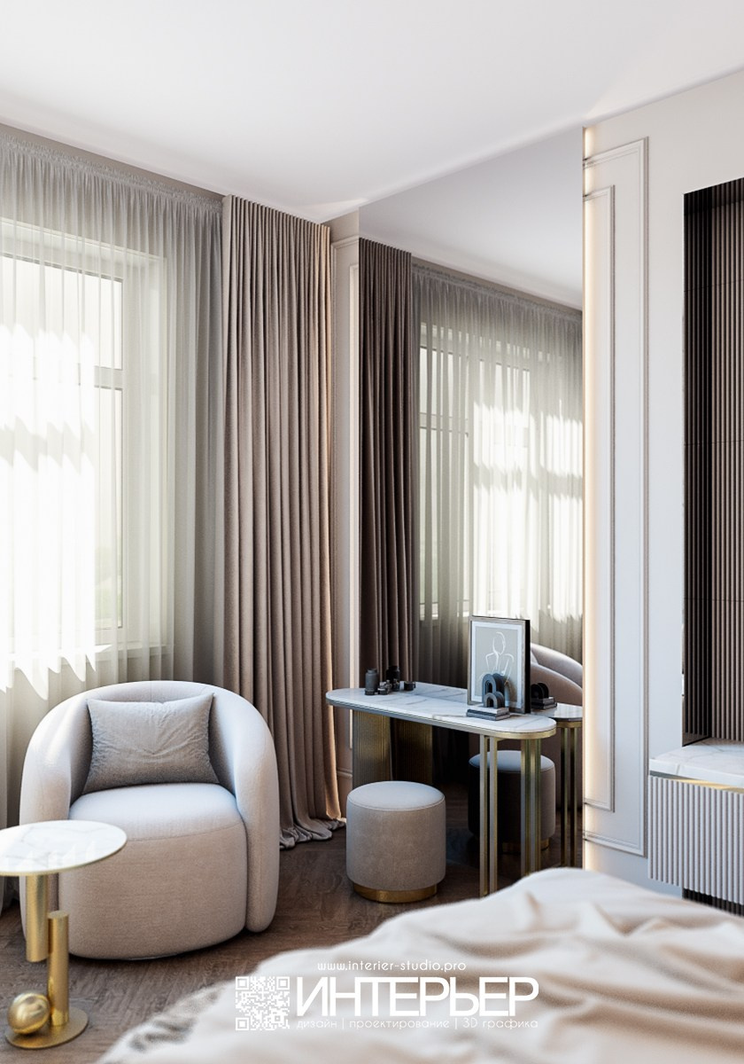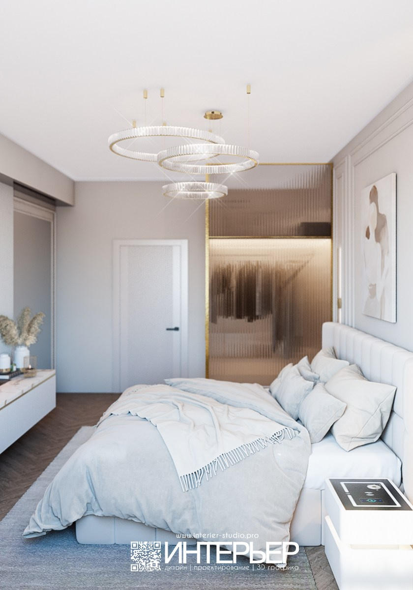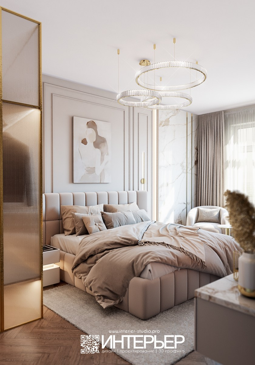 Проект спальни выполнен в светлой, элегантной стилистике с акцентом на комфорт, функциональность и визуальную целостность интерьера. Пространство было разделено на несколько зон, что позволило сделать спальню не только местом для сна, но и полноценным приватным пространством для отдыха и ухода за собой.