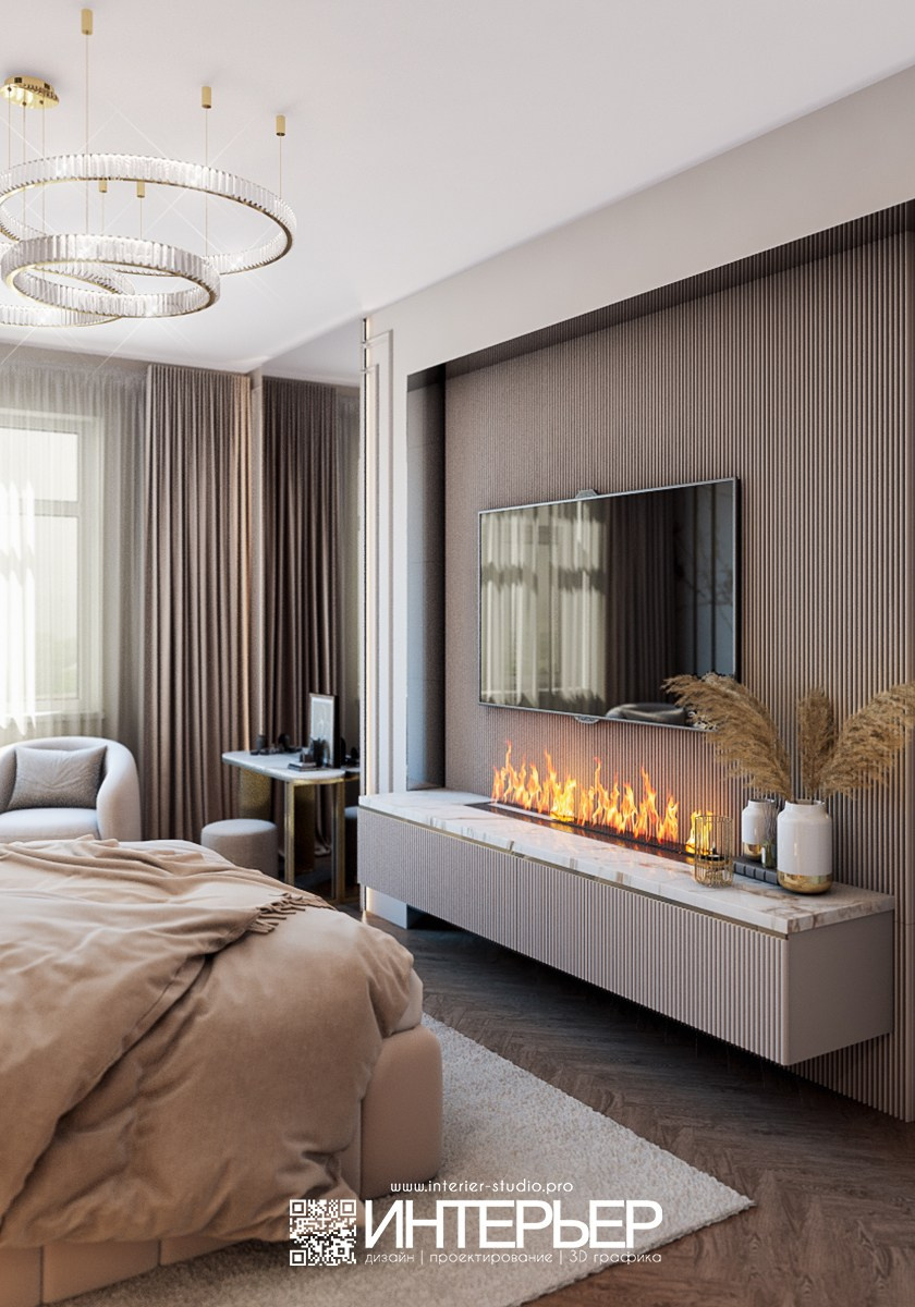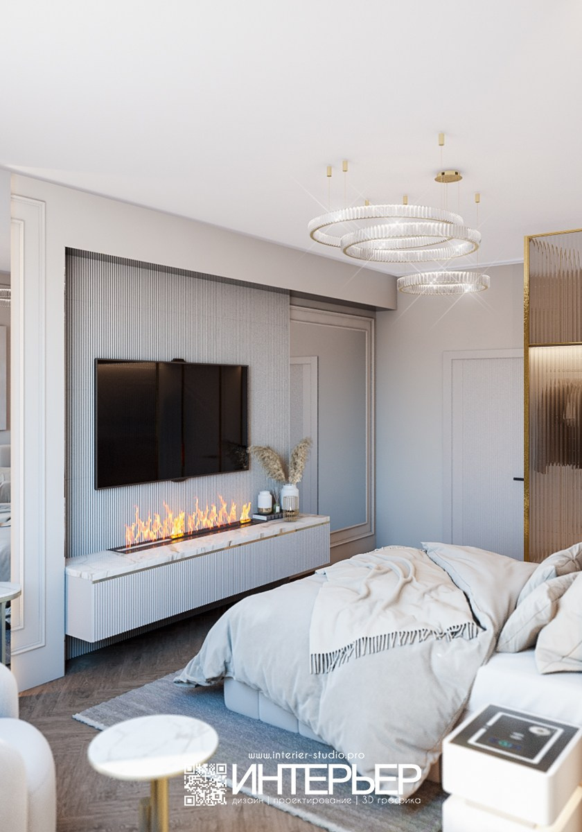 В зоне ТВ предусмотрена ТВ-тумба с встраиваемым паровым камином — он полностью безопасен, не нагревается и дополнительно работает как увлажнитель воздуха, создавая уютную атмосферу.