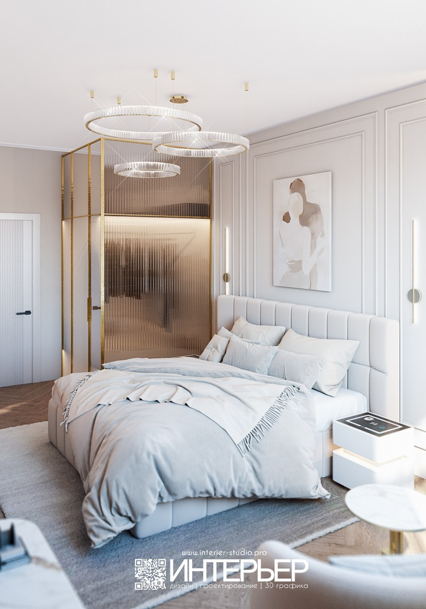 Проект разрабатывался с учетом стилистического и цветового сочетания с кухней, чтобы интерьер квартиры воспринимался цельным и гармоничным. Светлая палитра, молдинги, стекло, латунные акценты и мягкий текстиль создают ощущение уюта, спокойствия и премиальной сдержанности.